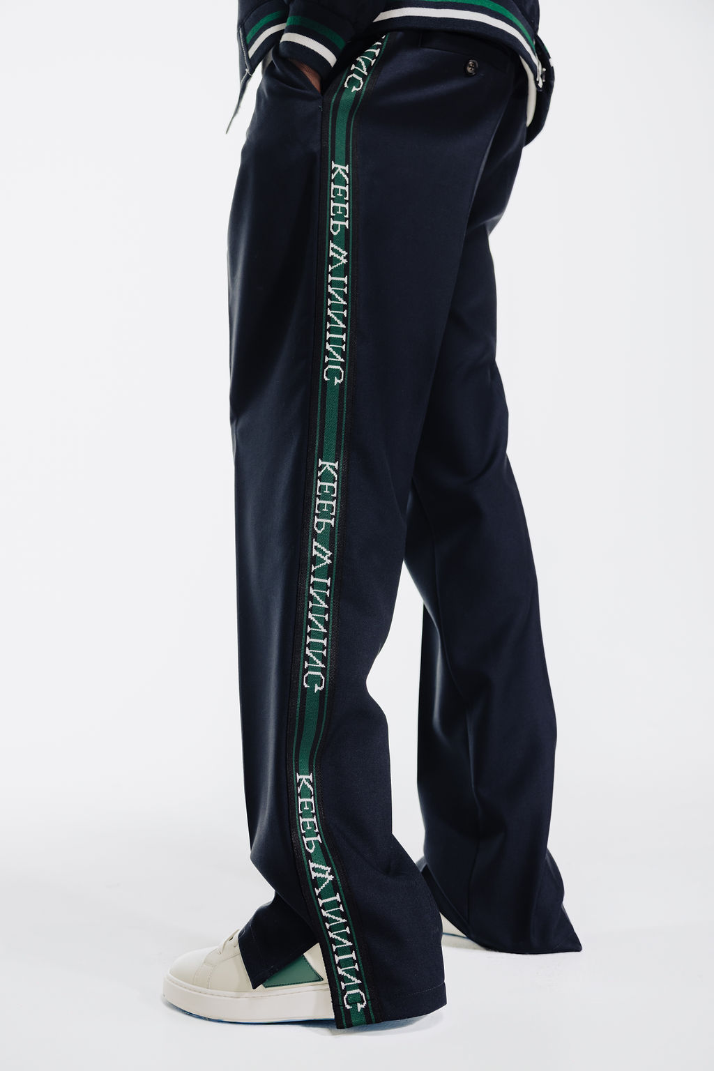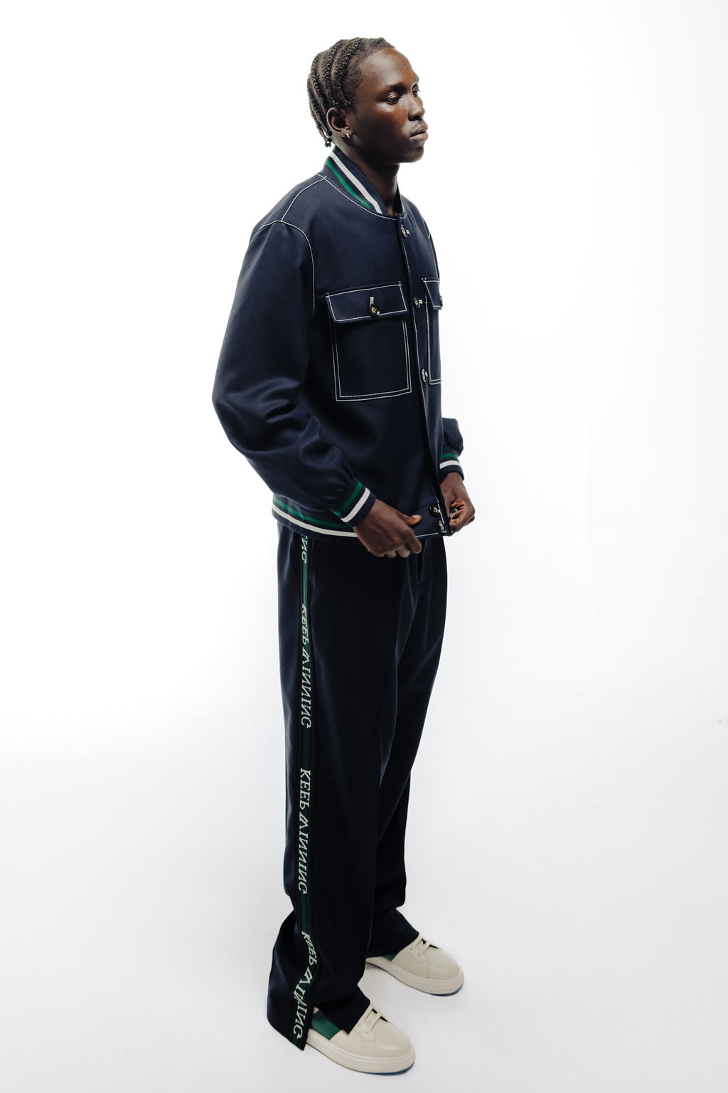 Designed with timeless style and smart detailing, theTracksuit Trouser offer a sophisticated look with a modern twist. Made from the same premium fabric blend as the matching tracksuit jacket— wool and polyester. The straight-fit silhouette creates a sleek, tailored appearance, combining effortlessly with the matching Relaxed Lapelless Blazer for a polished look. Keep Winning ribbon runs down the sides, adding a stylish touch.
