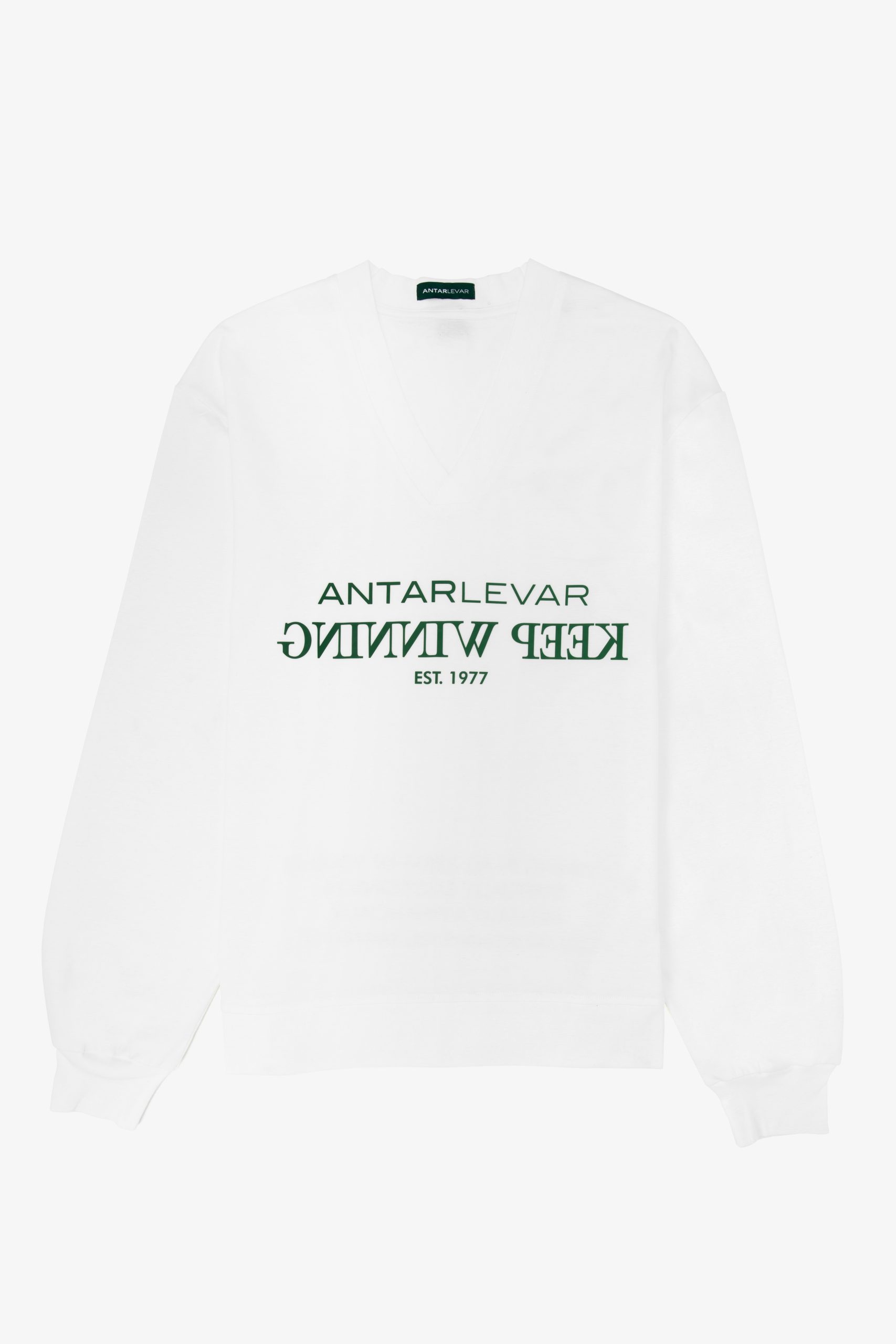 A unique V-shape collar design enhances the tee’s contemporary appeal, offering a refined touch to the classic long-sleeve silhouette. Branding is featured with the Antar Levar logo printed on both the front and the statement at the back, while the signature Antar Levar greene label, made from eco-friendly materials, is stitched at the back collar to reinforce the brand’s commitment to sustainability.